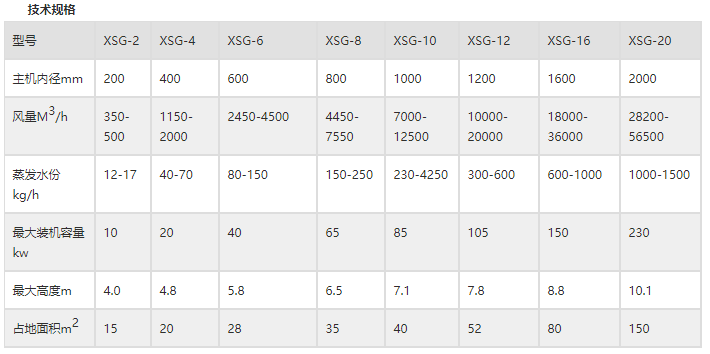 注:1.水分蒸發(fā)量是以進(jìn)風(fēng)溫度為1 80oC,出風(fēng)溫度為80oC 時(shí)每小時(shí)蒸發(fā)的水份,