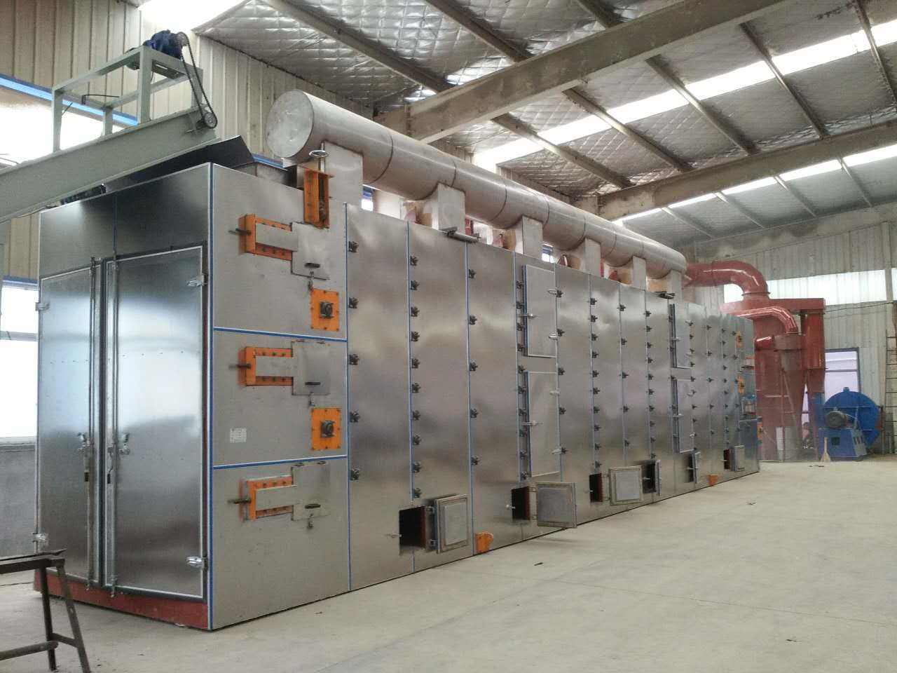 帶式干燥機(jī)是成批生產(chǎn)用的連續(xù)式干燥設(shè)備,用于透氣性較好的片狀、條狀、顆粒狀物料的干燥,對(duì)于脫水蔬菜、催化劑、中藥飲片等類含水率高、而物料溫度不允許高的物料尤為合適;該系列干燥機(jī)具有干燥速度快、蒸發(fā)強(qiáng)度高、產(chǎn)品質(zhì)量好的優(yōu)點(diǎn), 對(duì)脫水濾餅類的膏狀物料, 需經(jīng)造?;蛑瞥蓷l狀后方可干燥。